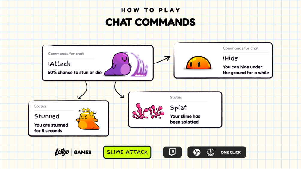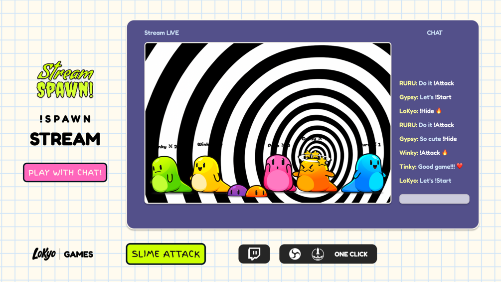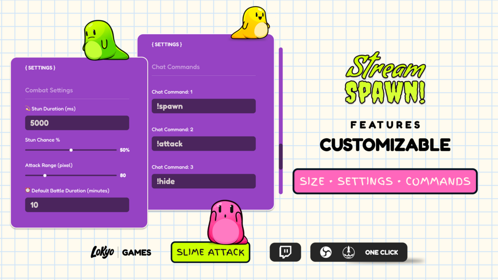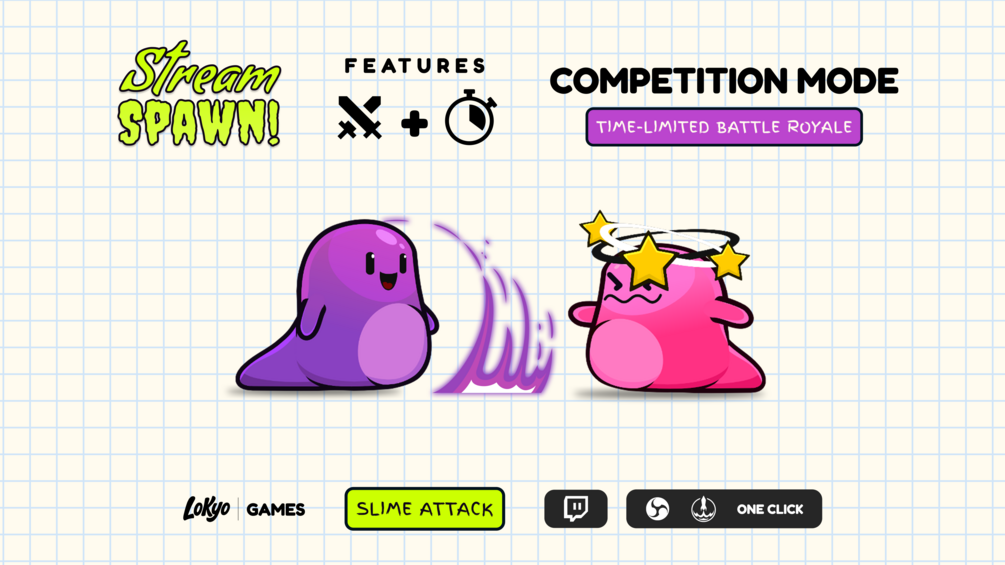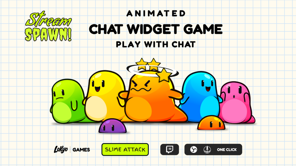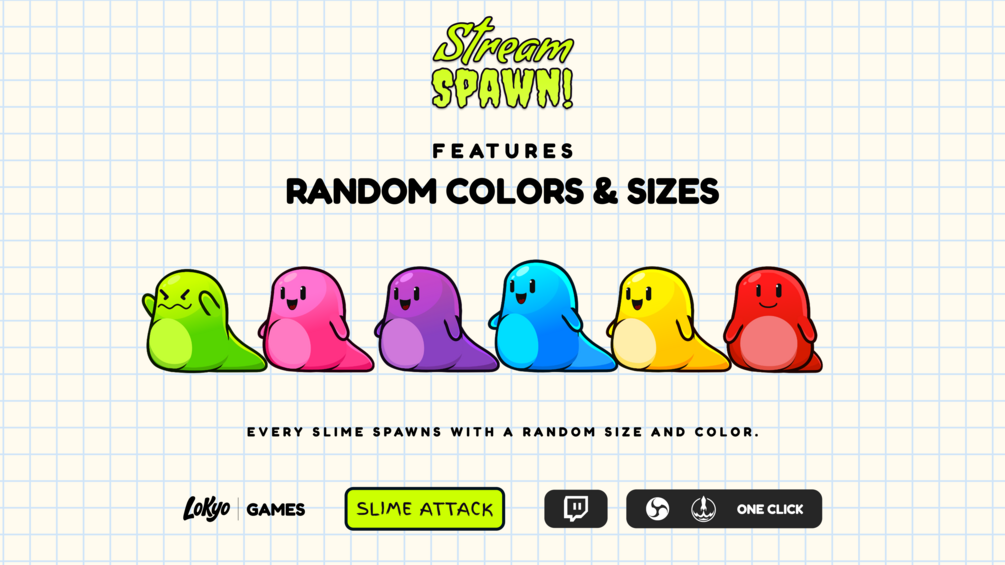 With Stream Spawn: Slime Attack, every viewer can summon their own colorful slime right on your stream using simple chat commands. Slimes spawn in random sizes and colors, wiggle around, bump into each other and enter a light-hearted battle where they can stun, splat or hide underground for a while.